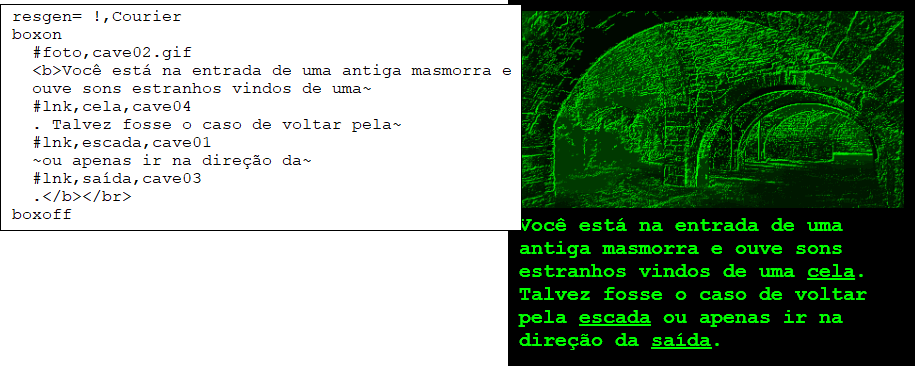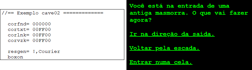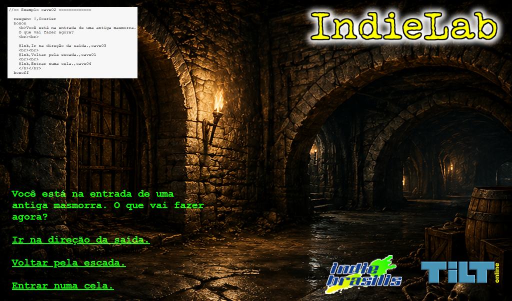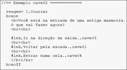 O primeiro script, executado automaticamente quando a aventura é iniciada, chama-se “start” e se ele não existir deverá ser criado neste momento. Por enquanto vamos usá-lo para viabilizar o nosso exemplo: o jogador estará na entrada de uma masmorra (chamada cave02) e poderá sair (cave03), voltar de onde veio (cave01) ou entrar numa cela (cave04).