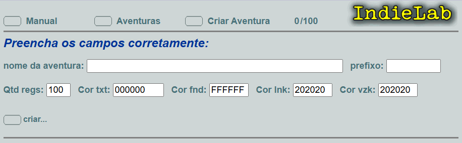Lembre-se que a sua aventura será hospedada com outras e portanto ela só será aceita (criada) se o prefixo escolhido por você for de fato exclusivo. Se já existir uma aventura com esse mesmo prefixo, terá que escolher outro.