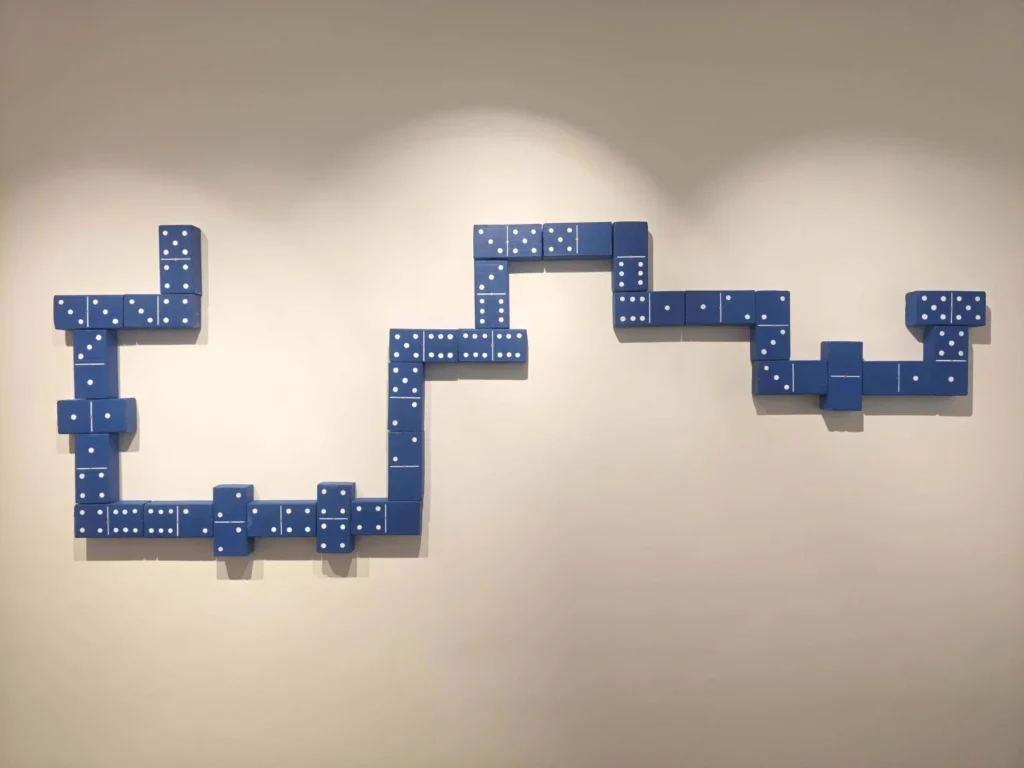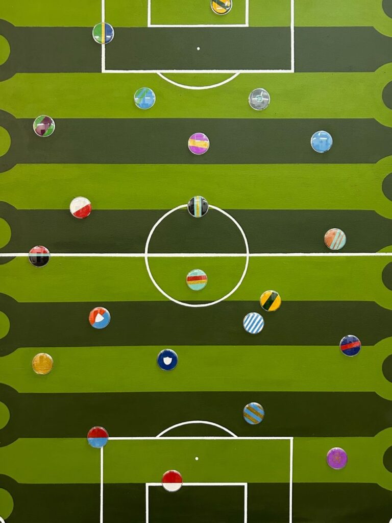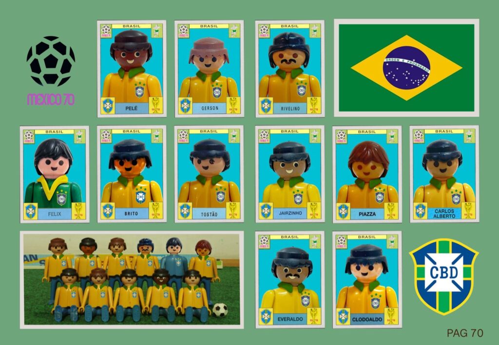 Um dos eixos centrais da pesquisa de Heberth Sobral é a figura do boneco Playmobil, que aparece em diferentes trabalhos da mostra. Entre os destaques está “Papá Golfe”, uma obra de grandes dimensões que funciona como um pequeno campo de golfe aberto à interação do público. Em outro espaço, uma série de fotografias organizadas como um álbum de figurinhas recria a seleção da Copa do Mundo de 1970, com nomes como Pelé, Rivellino, Gérson e Jairzinho, e o o “Dominó Azul”, da série Sala de Jogos, é composto por tijolos pintados e organizados visualmente como uma partida suspensa em uma instalação na parede,Outras referências trazem alusão ao automobilismo, esportes e a camisa do Rei Pelé.